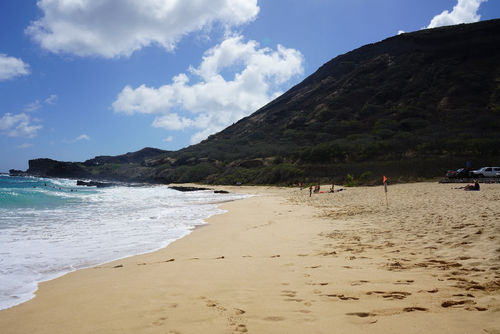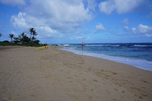A really nice beach equipped with life guards and bathroom facilities with outdoor showers. The beach has strong waves breaking close to the shore. If your not paying attention they will knock you right off your feet. Swimming is frowned upon here, but its a great spot for body boarders. The sand is really nice and there seems to be plenty of room for everyone. The parking area seemed like there was ample parking. As with any beaches here, plan on going early to get parking. The day I went there was also a nice Shaved Ice, drinks, smoothies, etc. stand. I'm sure they are there often, I would think, especially in the summer.